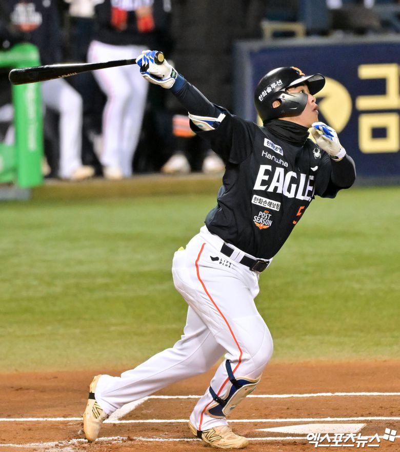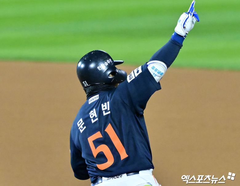 문현빈은 2볼-노스트라이크의 유리한 카운트에서 3구 127km/h 체인지업을 공략해 오른쪽 담장을 넘어가는 투런포를 터뜨렸다. 플레이오프에서 2홈런을 기록했던 문현빈의 한국시리즈 첫 홈런.