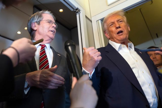 ▲ 27일(현지시간) 말레이시아 쿠알라룸푸르에서 일본 도쿄로 향하는 전용기(에어포스원)에서 도널드 트럼프 미국 대통령(오른쪽)이 스콧 베선트 미 재무장관을 가리키고 있다. ⓒAP=연합뉴스 |