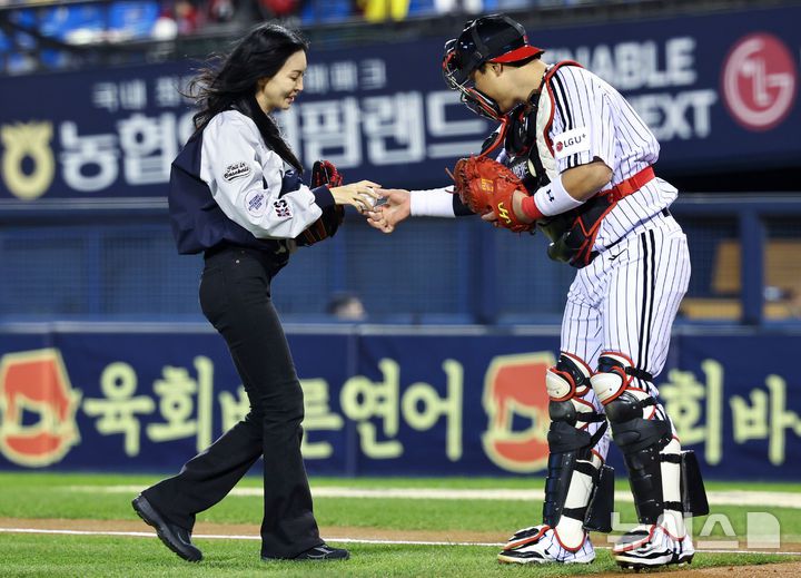 [서울=뉴시스] 최진석 기자 = 배우 김소연이 27일 오후 서울 송파구 잠실야구장에서 열린 2025 KBO 한국시리즈 2차전 한화 이글스와 LG 트윈스의 경기에 앞서 시구 후 공을 받고 있다. 2025.10.27. myjs@newsis.com