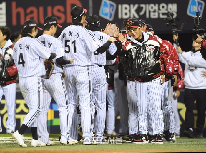 LG 염경엽 감독(맨 오른쪽)이 27일 잠실구장에서 열린 2025 KBO리그 한화와 한국시리즈 2차전에서 13-5 승리하며 2연승을 거둔 뒤 선수들과 하이파이브를 하고 있다. 잠실 | 박진업 기자 upandup@sportsseoul.com