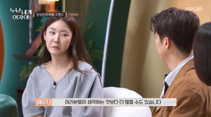 이에 한혜진은 한 숨을 내쉰 뒤 "나랑 띠동갑이면 몇 살이냐"면서 "서른이면 좀 힘들 것 같다. 좀 어린 감이 없지 않다. 그래도 서른 셋, 서른 넷 돼야 되지 않을까"라고 했다. 이에 황우슬혜는 "3년 차이다"고 하자, 한혜진은 "30대 초반이랑 중반이랑 확 달라진다. 인식의 차이가 달라진다"고 했다.