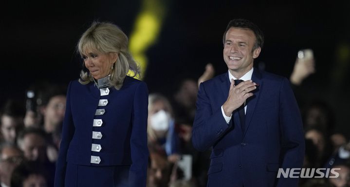 [파리=AP/뉴시스] 에마뉘엘 마크롱(오른쪽) 프랑스 대통령이 24일(현지시간) 대선 결선 투표에서 승리한 후 부인 브리지트 여사와 샹드마르스 광장을 찾아 지지자들을 향해 인사하고 있다. 마크롱 대통령의 연임으로 지난 20년간 이어졌던 프랑스의 ‘현직 대통령 재선 실패’ 징크스가 깨졌다. 2022.04.25.