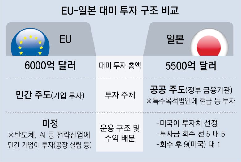 EU 모델의 핵심은 정부 주도의 현금성 투자가 아니라는 점이다. 미국이 투자처를 선정하면 일본 정부가 특수목적법인(SPV) 계좌에 현금을 보내는 일본식 모델과 달리 EU 모델은 민간 기업이 투자하고 EU는 금융 지원을 제공하는 구조다. EU는 7월 미국과 상호관세 및 자동차 품목관세를 15%로 낮추는 무역협정에 합의한 뒤 8월 공동 성명을 통해 이 같은 모델을 최종 확정했다. 공동 성명엔 “유럽 기업들은 2028년까지 미국 내 전략적 분야에 걸쳐 6000억 달러(약 859조 원)를 추가로 투자할 것으로 예상된다”는 문구가 명시됐다.