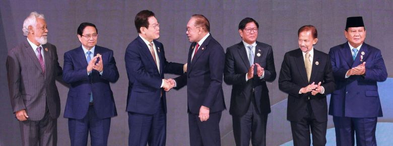 이재명 대통령이 27일 말레이시아 쿠알라룸푸르 컨벤션센터에서 열린 한-아세안 정상회의에서 올해 의장국인 말레이시아의 안와르 이브라힘 총리와 악수하고 있다. 왼쪽부터 사나나 구스마오 동티모르 총리, 팜민찐 베트남 총리, 이 대통령, 안와르 총리, 페르디난드 마르코스 필리핀 대통령, 하사날 볼키아 브루나이 국왕, 프라보워 수비안토 인도네시아 대통령. 쿠알라룸푸르=뉴시스 |