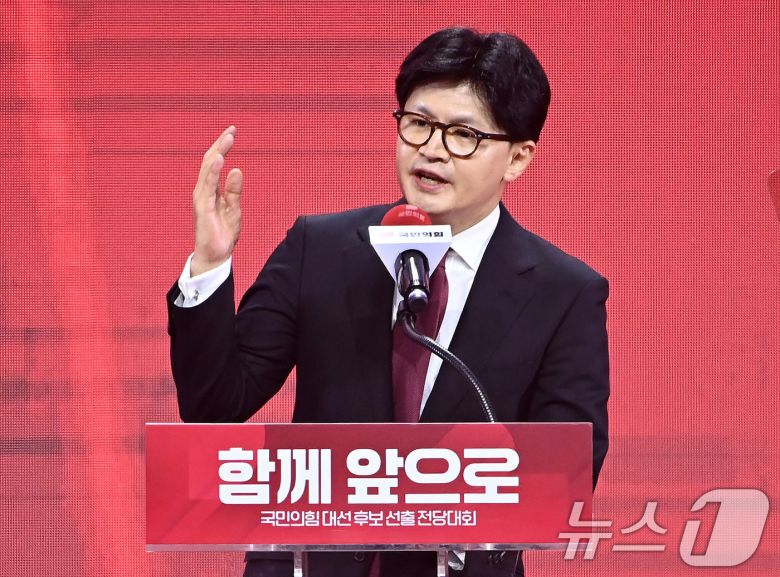 한동훈 국민의힘 대선 경선 후보가 3일 경기 고양시 킨텍스에서 열린 5차 전당대회에서 승복 연설을 하고 있다. (공동취재) 2025.5.3/뉴스1 ⓒ News1 이광호 기자