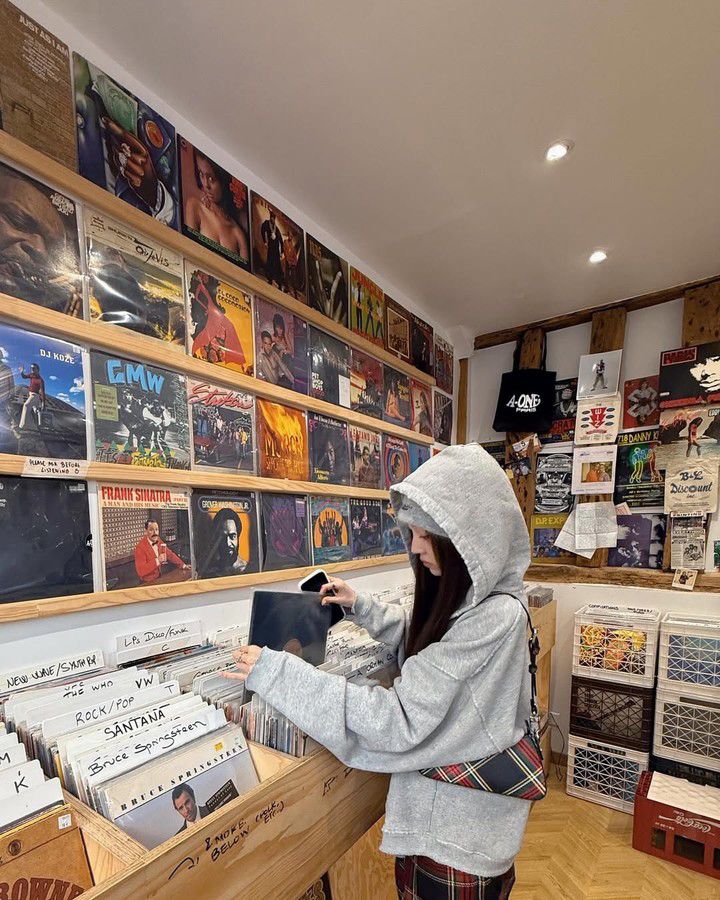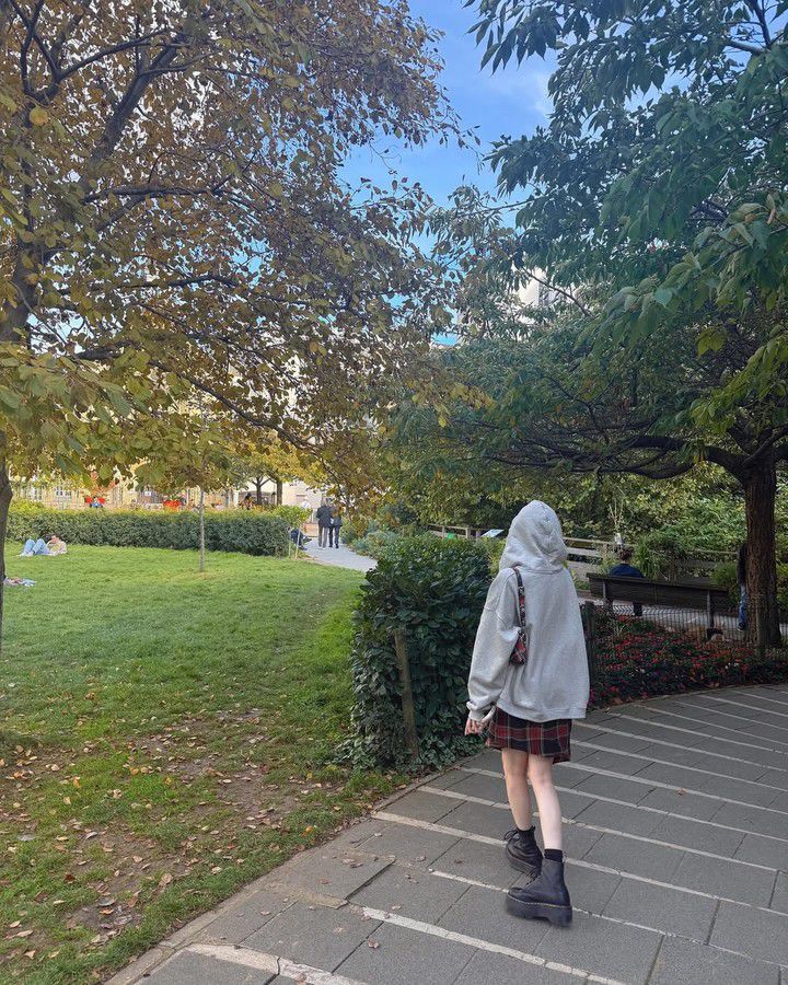 여유로운 실루엣의 그레이 후디와 체크 패턴 팬츠는 편안하면서도 구조적인 균형을 이루며, 삼각 쉐입의 크로스백은 룩에 입체감을 더했다. 톤다운된 비니는 전체 스타일에 안정감을 부여하면서 실내외를 아우르는 실용적인 스타일링을 완성했다.