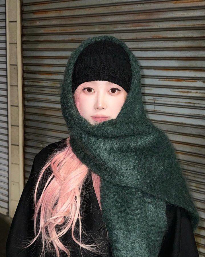 초록 니트 머플러 위로 비니를 겹쳐 착용해 방한성과 스타일을 동시에 살렸으며, 소품의 중첩을 통해 계절감과 개성을 동시에 표현했다.