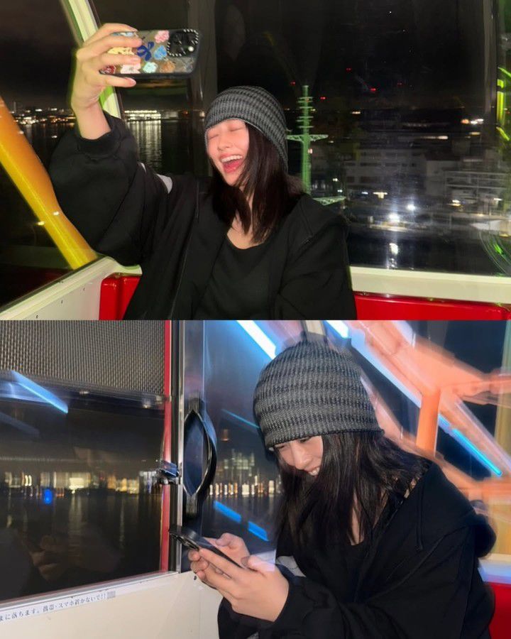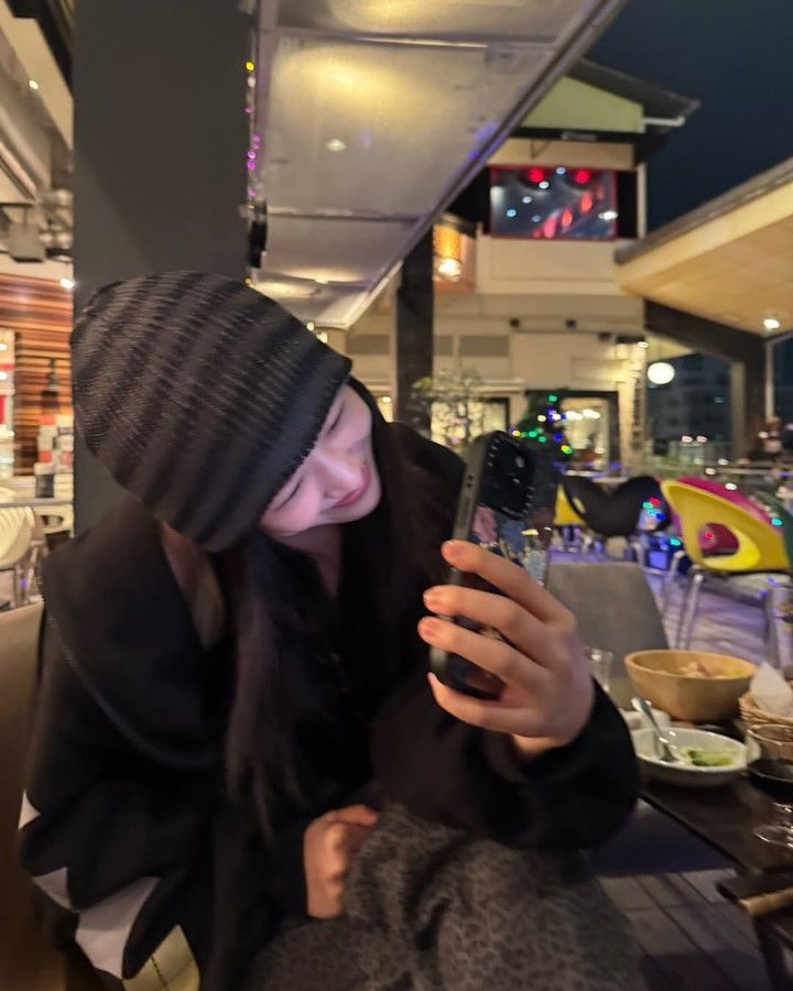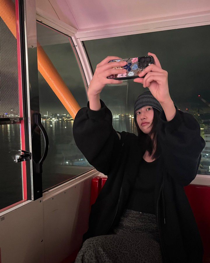 진회색 골지 비니는 블랙 아우터와 호피 패턴 스커트 사이의 텍스처 대비를 부드럽게 연결하며, 얼굴을 감싸는 실루엣으로 따뜻하면서도 단정한 이미지를 연출했다. 관람차 조명과 어우러진 룩은 도시적인 무드를 배가시켰다.