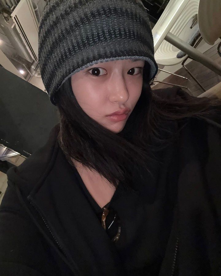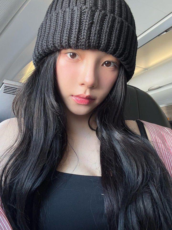그룹 에스파 카리나는 에어포트 룩에서 블랙 니트 비니로 실루엣의 안정감을 부여했다.