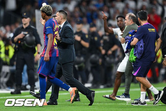 일단 진정되는 듯했지만, 비니시우스가 멀리서 야말을 향해 다시 소리를 지르며 감정이 재점화됐다. 벤치에 있던 안토니오 뤼디거와 다비드 알라바, 바르셀로나의 하피냐까지 뛰어들며 현장은 아수라장이 됐다. 결국 마르쿠스 소르그 코치가 급히 선수들을 제지하며 대형 충돌로 번지는 것을 막았다.