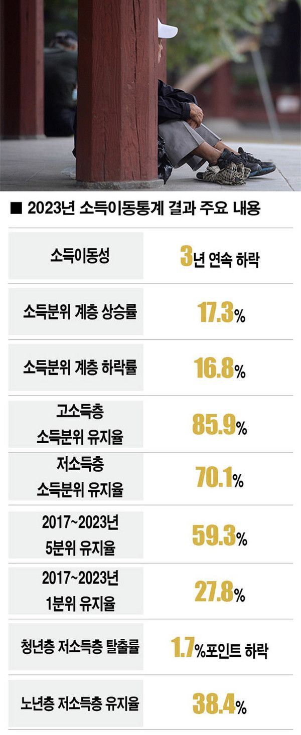 2023년 한해 소득이 늘어 계층(소득분위)이 상승한 국민은 10명 중 2명이 채 안 됐다. 소득을 발판으로 계층을 끌어올리는 게 그만큼 어렵다는 얘기다. 지난 10월 27일 국가데이터처가 '2023년 소득이동통계 결과'를 토대로 분석한 내용이다.