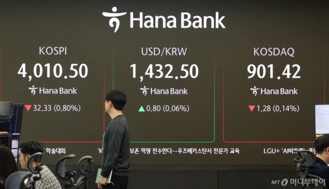 (서울=뉴스1) 황기선 기자 = 28일 오전 서울 중구 하나은행 딜링룸에 코스피 시황이 표시되고 있다. 이날 코스피는 32.36p(0.80%) 내린 4010.47로 시작, 코스닥은 0.12p(0.01%) 오른 902.82로 장을 시작했다. 2025.10.28/뉴스1 Copyright (C) 뉴스1. All rights reserved. 무단 전재 및 재배포, AI학습 이용 금지. /사진=(서울=뉴스1) 황기선 기자 |