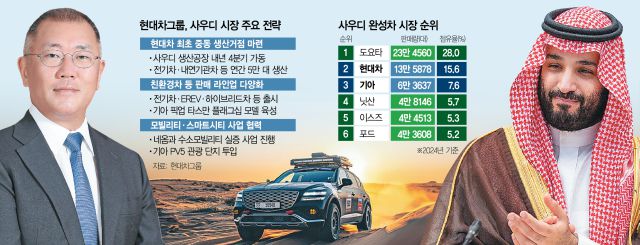사우디는 중동 최대 자동차 시장으로 현대차그룹은 도요타에 이어 시장점유율 2위를 달리고 있다. 도요타의 현지 판매량은 지난해 기준 23만4560대(점유율 28.0%)이며 2위 현대차(13만 5878대, 15.6%)와 3위 기아(6만 3637대, 7.6%)가 뒤를 바짝 쫓고 있다. 올해는 현대차와 기아가 지난해보다 5.9% 늘어난 21만 대를 판매한다는 계획이다.