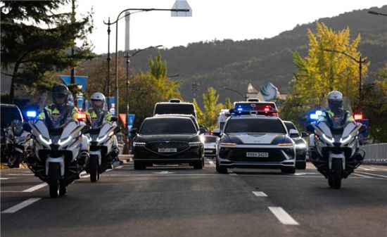경호안전통제단이 지난 25일과 27일 경주와 부산 일대에서 '2025년 APEC정상회의' 경호안전 대비를 위한 FTX(종합상황훈련)을 실시했다. 사진은 참가국 국빈들의 안전한 이동을 위해 기동훈련을 하는 모습. 사진=대통령경호처 제공 |