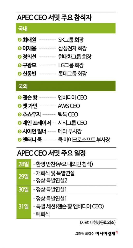 이 밖에도 해외 주요 인사들도 대거 참석한다. 사이먼 칸 구글 아태지역 부사장, 제인 프레이저 시티그룹 CEO, 대니얼 핀토 JP모건 부회장, 호아킨 두아토 존슨앤드존슨 CEO, 젠슨 황 엔비디아 CEO 등이 참석해 자리를 빛낸다. 최 회장은 CEO 서밋에 앞서 초대사를 통해 "큰 기대를 가지고 역사와 미래가 만나는 경주로 여러분을 맞이할 소중한 기회를 기다리고 있다"며 "우리는 함께 지속적인 협력 관계를 구축하고 아시아 태평양 전역에서 더 번영하고 탄력적인 미래를 위한 새로운 길을 개척할 수 있다"고 밝혔다