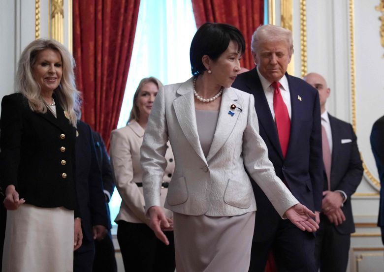 28일 일본 도쿄 아카사카 영빈관에서 도널드 트럼프 미국 대통령(오른쪽)과 다카이치 사나에 일본 총리(왼쪽)가 회담장으로 입장하고 있다./AFP 연합뉴스