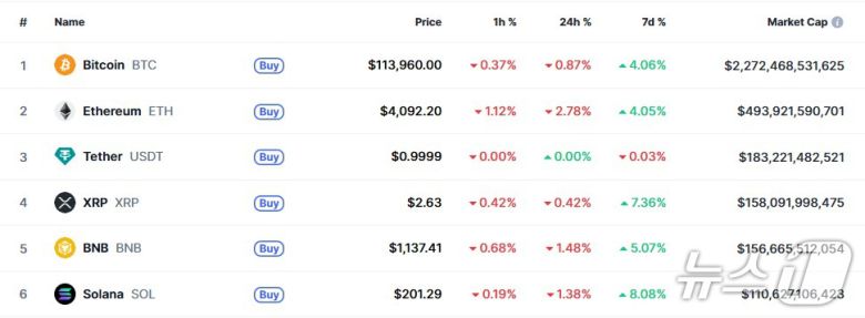 이 시각 현재 주요 암호화폐 시황 - 코인마켓캡 갈무리