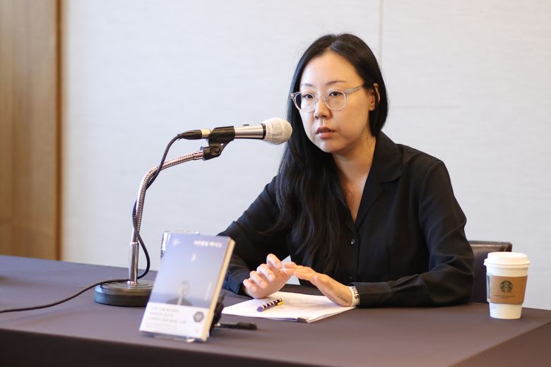 김아나 작가가 28일 서울 중구 프레스센터에서 열린 <4인칭의 아이들> 출간 기념 기자간담회에서 질문에 답하고 있다. 연합뉴스 |