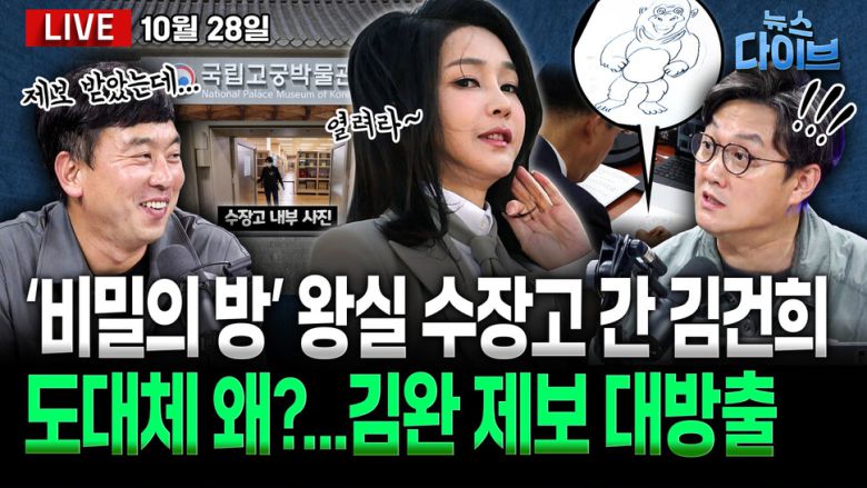 출연: 김완 한겨레21 취재 2팀 팀장, 오윤혜 방송인, 박영식 시사평론가, 신인규 변호사, 권태호 한겨레 논설실장, 진행: 고현준. 조선왕실 ‘수장고’ 간 김건희, 도대체 왜?... 김완, 제보 대방출 / 경주로 가는 ‘극우’... APEC 앞 ‘혐중 시위’ 우려 / 국감서 고릴라 그린 유영하... 국힘 ‘딴지·무능’, ‘야당의 시간’ 버렸다 / 이진관 판사 “한덕수 판결 11월 마무리”... 그런데 지귀연은? / “이재명 뇌물 편지 가필... ‘조작’ 의견 묵살” 감정관 폭로 / ‘1313호 검사실’서 ‘안부수 딸 특혜 면회’ 이재명에 불리한 진술 대가? / ‘부동산 대책’ 서울시장 선거 영향? 이 대통령 지지율은 굳건. 오늘 (10월 28일) 뉴스 다이브 많은 시청바랍니다. 제작: 뉴스영상부
