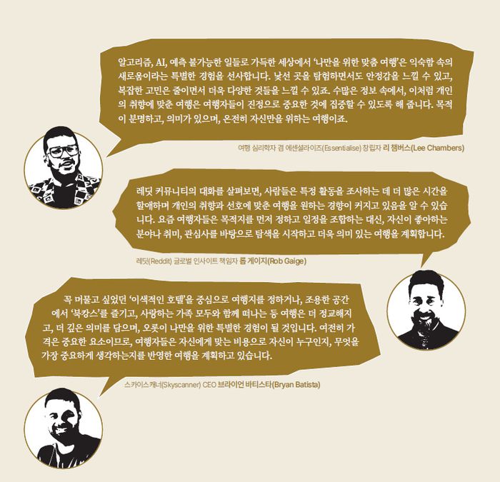 “자신이 좋아하는 분야나 취미, 관심사를 바탕으로 여행지를 탐색하고 의미 있는 여행을 계획한다”는 레딧 글로벌 인사이트 책임자 롭 게이지의 말로 다시 돌아가보자. 이제 여행은 단순히 ‘일상을 벗어난 휴가’나 물리적 공간을 둘러보는 것 그 이상의, 개인 맞춤형 경험이 되어가고 있다. ‘나만의 맞춤형 여행’이라는 여행 트렌드는 앞으로도 오랜 기간 지속될 것으로 보인다.