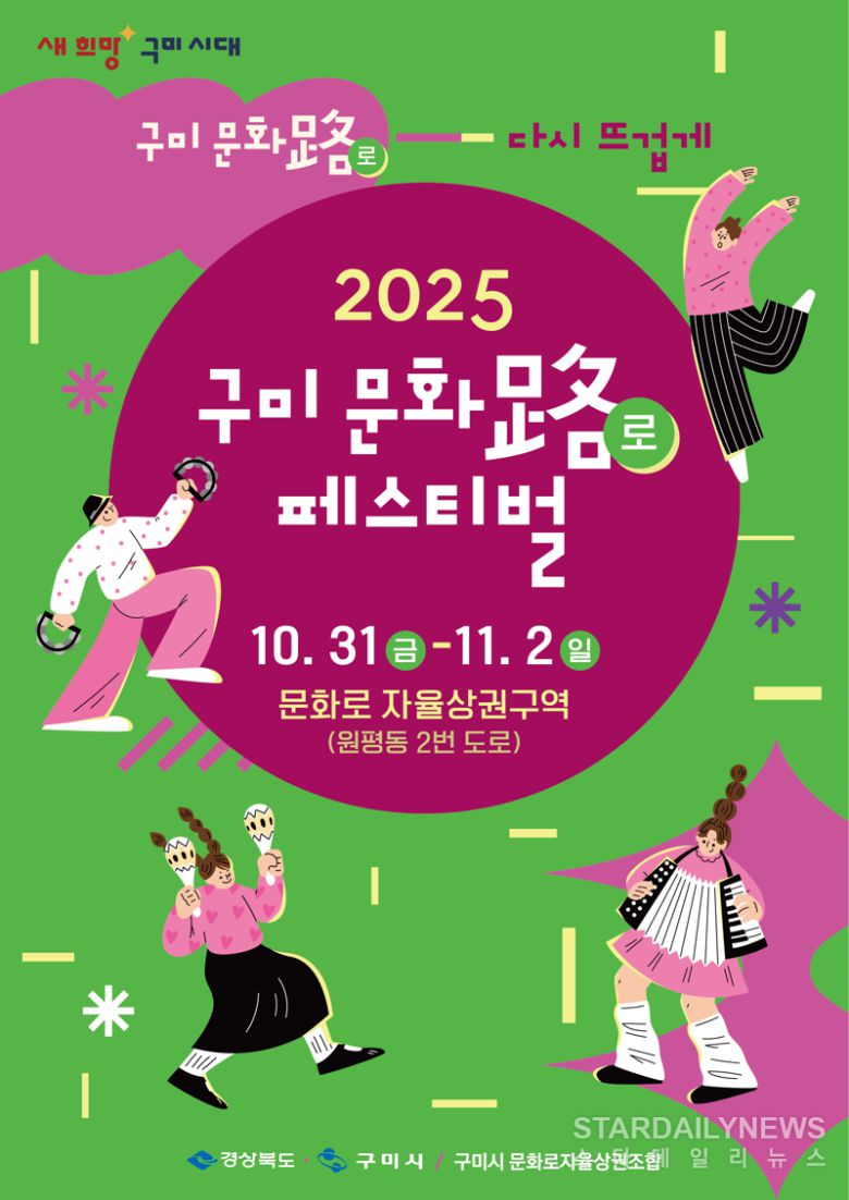 [스타데일리뉴스=정상훈기자] 구미시는 오는 31일부터 다음달 2일까지 3일간 구미역 앞 문화로 자율상권구역(원평동 2번도로) 일대에서 '2025 구미 문화로 페스티벌'을 개최한다. 개막식은 오는 31일 오후 6시 NH농협 구미지점 주차장에서 열린다. 같은 날부터 다음달 30일까지는 구미중앙로 93에서 '구미마을 젤리상점' 팝업스토어도 문을 연다.