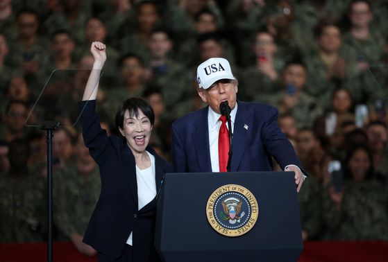 도널드 트럼프 미국 대통령(오른쪽)이 28일 일본 가나가와현 요코스카에 있는 미 항공모함 조지워싱턴호 함상에 승선해 연설하고 있다. 왼쪽은 다카이치 사나에 일본 총리. 로이터=연합뉴스