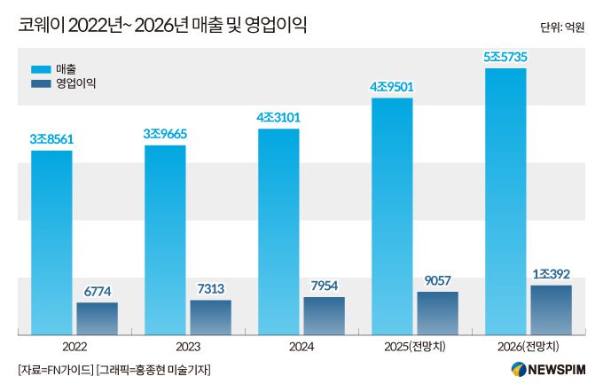 실적 성장세도 뚜렷하다. 코웨이의 연간 영업이익은 ▲2022년 6774억원 ▲2023년 7313억원 ▲2024년 7954억원으로 꾸준히 증가하고 있으며, 올해는 9000억원 돌파가 유력하다. 매출 역시 2022년 3조8000억원 수준에서 올해는 약 5조원 수준으로 성장할 것으로 기대된다.