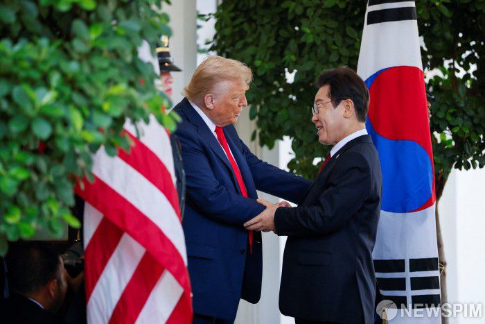 [워싱턴 로이터=뉴스핌] 이재명 대통령이 25일(현지시간) 미국 워싱턴 D.C. 백악관에서 도널드 트럼프 대통령과 정상회담을 앞두고 인사를 나누고 있다. 2025.08.26 photo@newspim.com |