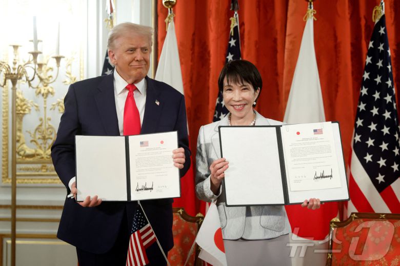 도널드 트럼프 미국 대통령과 다카이치 사나에 일본 총리가 지난 28일(현지시간) 도쿄 아카사카궁에서 미일 무역 협정에 서명한 뒤 이를 들어보이고 있다. ⓒ 로이터=뉴스1 ⓒ News1 류정민 특파원 |