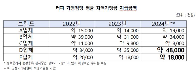29일 국회 산업통상자원중소벤처기업위원회 소속 허영 더불어민주당 의원이 공정거래위원회로부터 제출받은 자료에 따르면, 커피·치킨·피자 프랜차이즈별 상위 5개 브랜드(가맹점 수 기준) 중 13곳이 최근 3년간 평균 차액가맹금 자료를 공개했다.
