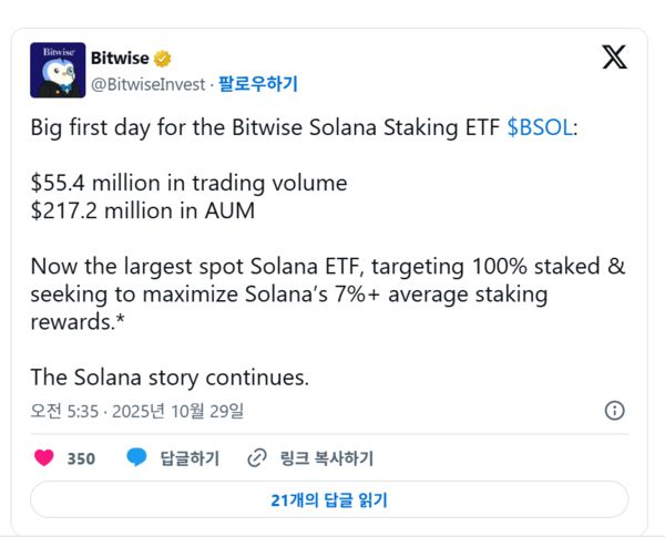 29일(현지시간) 비트와이즈는 공식 소셜미디어 X를 통해 BSOL의 첫날 거래량이 5540만 달러(약 793억원)에 달했고, 총 운용자산(AUM)은 2억1720만 달러(약 3108억원)를 기록했다고 밝혔다.