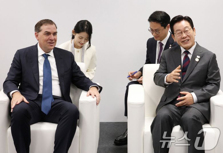 이재명 대통령이 29일 경북 경주예술의전당에서 맷 가먼 아마존웹서비스(AWS) CEO를 접견하고 있다. (APEC 2025 KOREA 제공. 재판매 및 DB 금지) 2025.10.29/뉴스1 |