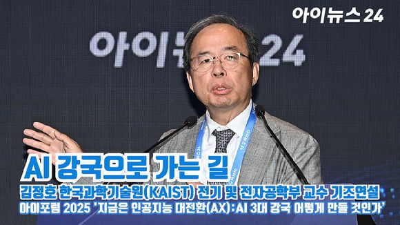 김정호 한국과학기술원(KAIST) 전기 및 전자공학부 교수가 지난 23일 서울 영등포구 여의도동 FKI타워컨퍼런스센터에서 열린 '아이포럼2025-지금은 인공지능 대전환(AX):AI 3대 강국 어떻게 만들 것인가'에 참석해 'AI 강국으로 가는 길'을 주제로 기조연설을 하고 있다. [영상=문수지 기자]
