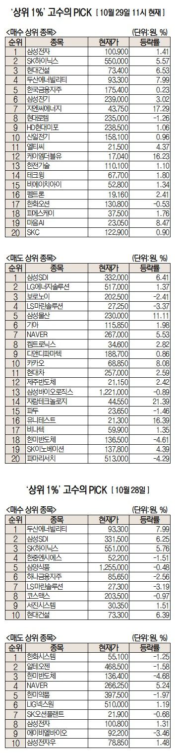 미래에셋증권에서 거래하는 고수익 투자자들이 29일 오전 가장 많이 순매수한 종목은 삼성전자(005930), SK하이닉스(000660), 현대건설(000720), 두산에너빌리티(034020) 등으로 집계됐다.