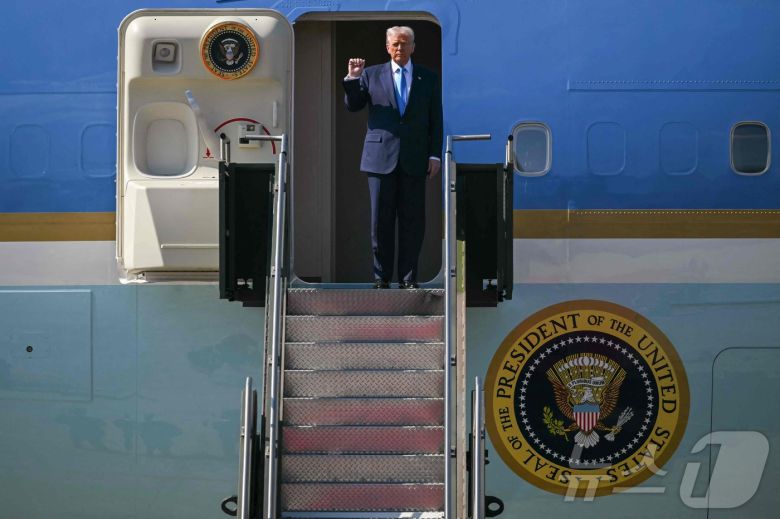 도널드 트럼프 미국 대통령이 29일 전용기 에어포스원에서 내리기 전 포즈를 취하고 있다. 트럼프 대통령은 일본 일정을 마치고 이날 김해공항에 도착했다. 2015.10.29 ⓒ AFP=뉴스1 ⓒ News1 최종일 선임기자 |