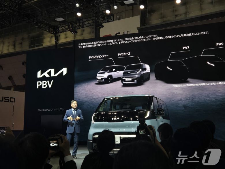 29일 일본 도쿄 빅 사이트에서 열린 '재팬 모빌리티쇼 2025'에서 김상대 기아 PBV비즈니스사업부장이 목적기반차량(PBV) 'PV5'를 일본 시장에 최초로 공개하고 있다. 2025.10.29/뉴스1 김성식 기자 |