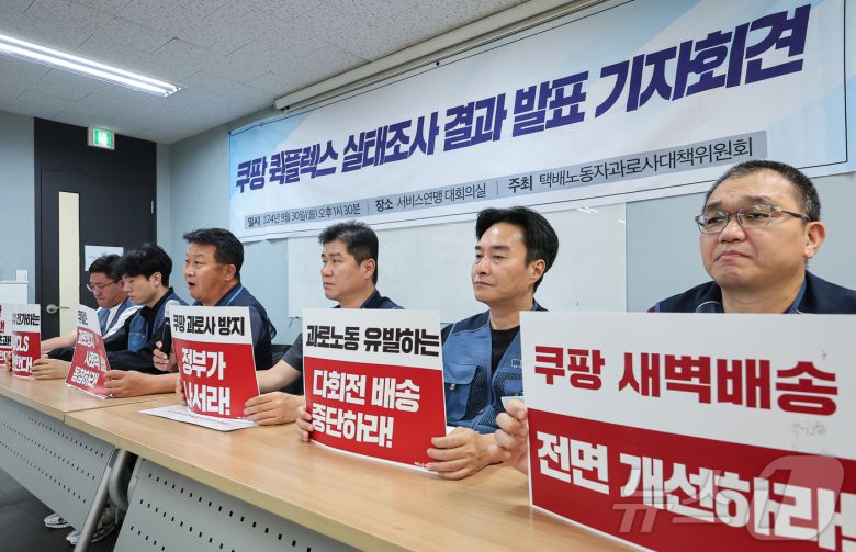 택배노동자과로사대책위원회 회원들이 지난 9월 30일 서울 서대문구 전국서비스산업노동조합연맹에서 '쿠팡 택배노동자 실태조사 결과 발표 기자회견'을 하고 있다. 2024.9.30/뉴스1 ⓒ News1 김도우 기자