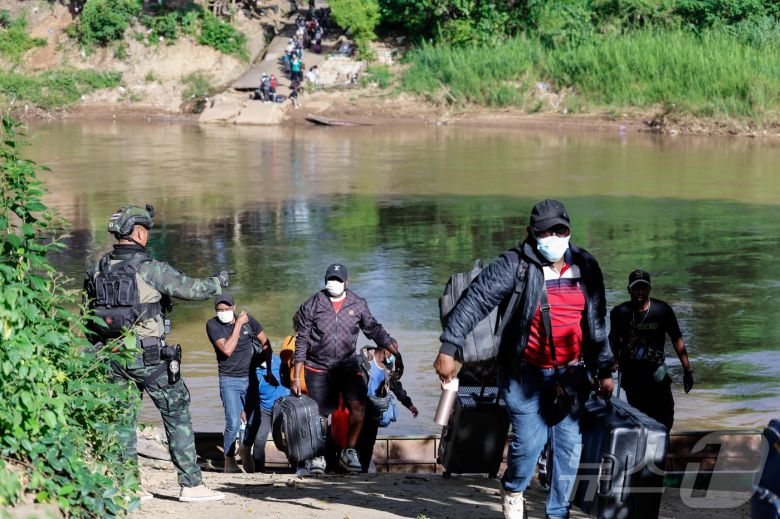 24일(현지시간) 미얀마 KK 파크 단지에서 일하던 근로자들이 짐을 들고 모에이 강을 건너 태국으로 피신하고 있다. 2025.10.24. ⓒ AFP=뉴스1 ⓒ News1 이정환 기자 |