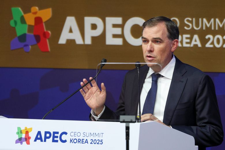 사이먼 밀너 메타 아태 공공정책 부사장이 29일 경북 경주 예술의전당에서 열린 2025 아시아태평양경제협력체(APEC) 정상회의 최고경영자(CEO) 서밋에서 주제발표를 하고 있다./연합뉴스 |