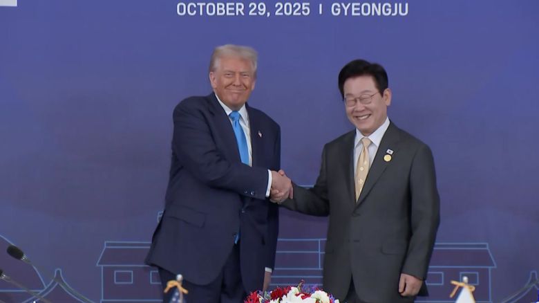 트럼프 대통령, 옷매무새를 다듬고 이재명 대통령과 악수를 하고 있습니다.
