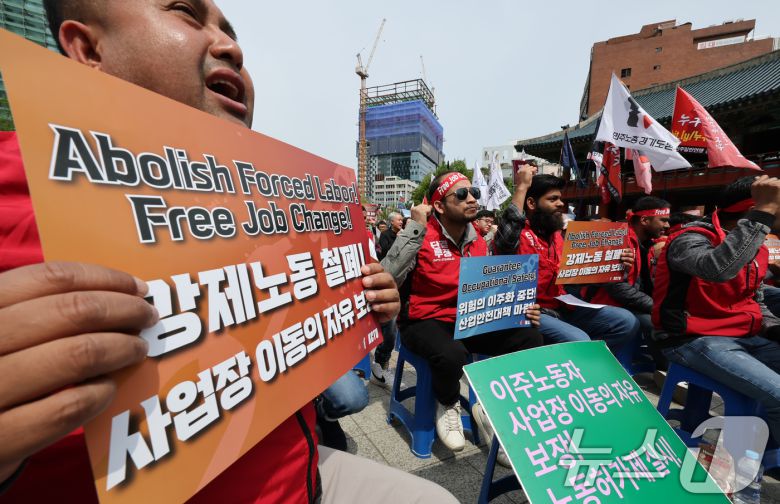 민주노총 이주노동자노조 조합원들이 27일 오후 서울 종로구 보신각 앞에서 '2025 세계 노동절, 이주노동자 메이데이' 집회를 열고 사업장 변경 자유화, 위험의 이주화 중단을 촉구하고 있다. (사진은 기사 내용과 무관함) 2025.4.27/뉴스1 ⓒ News1 장수영 기자 |