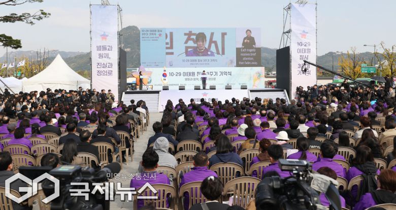 (서울=국제뉴스) 29일 서울 종로구 광화문광장에서 열린 10.29 이태원 참사 3주기 기억식 추모행사를 하고 있다./사진=이용우 기자