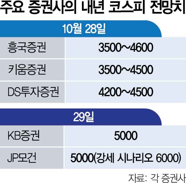 KB증권 역시 내년 코스피 목표를 5000으로 크게 높였다. 한국투자증권(4600), 키움증권(3500~4500), 흥국증권(3500~4600) 등 내년 코스피 전망치를 내놓은 증권사 가운데 가장 높다. KB증권은 1986~1989년 3저 호황, 2003~2007년 브릭스 시대에 이어 세 번째 증시 호황기라고 진단했다. 과거 상승장마다 달러가 추세적인 약세 흐름을 보이면서 밸류에이션(PBR)이 높아지는 공통점이 관찰됐는데 이번에도 같은 현상이 나타나고 있다는 것이다. 한국 증시 특성상 강한 강세장이 지나면 15년 넘는 횡보장이 이어진다. 이번 상승장 타이밍을 놓치면 15~20년을 기다려야 할 수 있다는 분석이다.