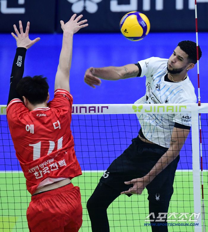 29일 수원체육관에서 열린 배구 V리그 남자부 한국전력과 현대캐피탈의 경기. 현대캐피탈 레오가 한국전력 블로킹을 앞에 두고 스파이크를 날리고 있다. 수원=송정헌 기자songs@sportschosun.com/2025.10.29/