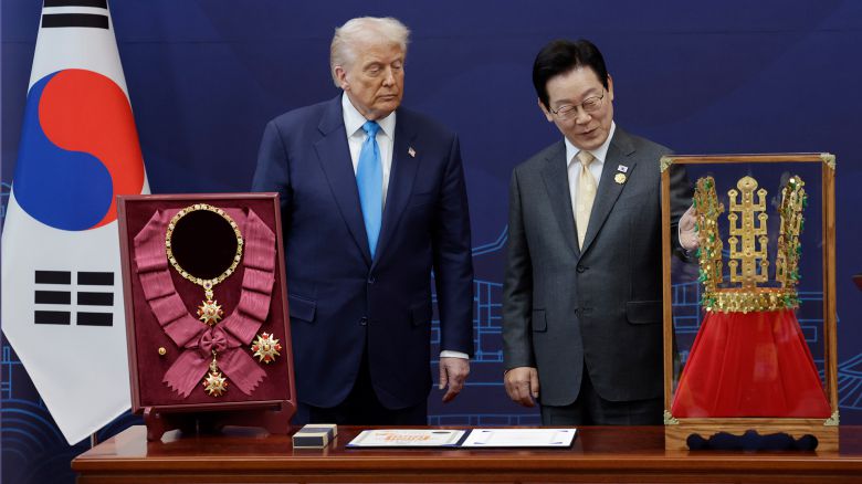 이재명 대통령은 오늘(29일) 정상회담을 위해 경주에 도착한 트럼프 대통령에게 우리나라 최고 훈장인 무궁화 대훈장을 수여하고 특별 제작한 천마총 금관 모형을 선물했습니다.
