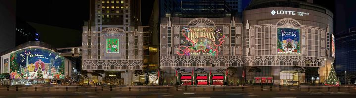본점과 잠실점 외벽에는 총 3만 개의 LED 조명을 활용한 ‘롯데타운 크리스마스 파사드’가 화려하게 펼쳐진다.
