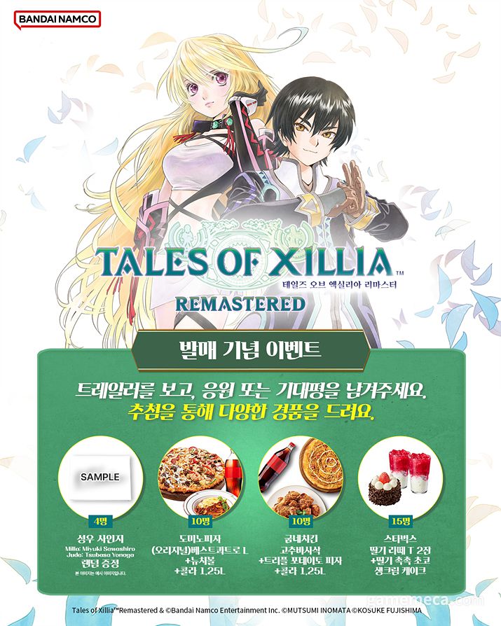 론치 트레일러를 보고 기대평을 남기면, 추첨을 통해 ‘테일즈 오브 엑실리아 리마스터’의 성우 사인지(4명), 피자 쿠폰(10명), 치킨 쿠폰(10명), 케이크와 커피 쿠폰(15명)을 증정한다. 해당 이벤트는 11월 21일 금요일까지 진행된다. 이벤트 응모 기간은 30일 목요일부터 11월 21일 금요일까지다. 발표는 11월 28일 금요일이며, 포스팅 발표 후 개별 안내된다.