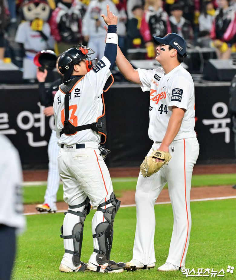 위기 상황에서 한화의 선택은 마무리 김서현이었다. 마무리지만 정규시즌 막판부터 내용과 결과가 좋지 않았다. 이날도 폭투로 한 점을 내주며 불안한 모습을 보였다. 그때 포수 최재훈이 마운드에 올라가 김서현을 격려했다.