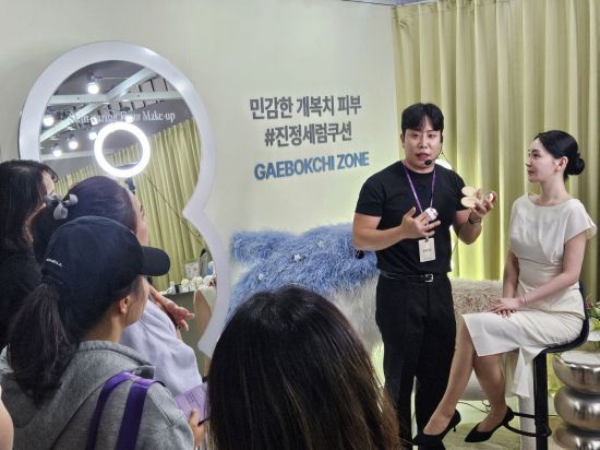 30일 서울 중구 동대문디자인플라자(DDP) 아트홀 안 '프레시안' 브랜드 부스에서 메이크업 시연이 진행되는 모습. 박재현 기자 |