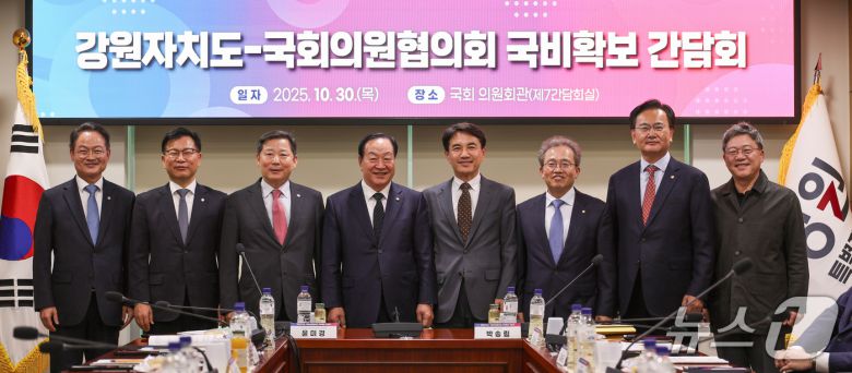 (춘천=뉴스1) 이종재 기자 = 김진태 강원도지사는 30일 오후 국회 의원회관에서 도내 지역구 국회의원 7명과 함께 도-국회의원 협의회를 열고 2026년도 국비 추가 확보 방안 등을 논의했다.